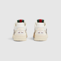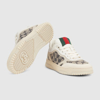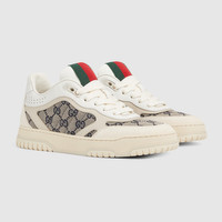 The first sneakers envisioned by Sabato De Sarno for the House, the Re-Web sees Gucci’s heritage stripes as a bold statement detail on a contemporary silhouette. This pair is crafted from the iconic Original GG canvas and beige leather. Defined by multiple iconic details, this new sneaker takes center stage with the bold green and red Web tongue. - Beige and blue GG canvas - Women's - Beige leather trim - Rubber outsole with Interlocking G and Gucci script logo - Gucci script and Interlocking G Web tag - Interlocking G details on the eyelets - Stitching detailing recalling the Web - Tongue with Web - Additional pair of laces included - Lace-up closure - Low heel - 1.2" heel height - Made in Italy - This style runs big, we recommend sizing down