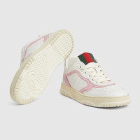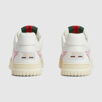 The first sneakers envisioned by Sabato De Sarno for the House, the Re-Web sees Gucci’s heritage stripes as a bold statement detail on a contemporary silhouette. This pair is crafted from white leather with a pink leather trim detail. Defined by multiple iconic details, this new sneaker takes center stage with the bold green and red Web tongue. - White leather - Women's - Pink leather detail - Rubber outsole with Interlocking G and Gucci script logo - Gucci script and Interlocking G Web tag - Interlocking G details on the eyelets - Stitching detailing recalling the Web - Tongue with Web - Additional pair of laces included - Lace-up closure - Low heel - 1.2" heel height - Made in Italy