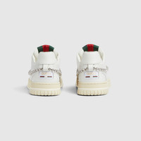 The first sneakers envisioned by Sabato De Sarno for the House, the Re-Web sees Gucci’s heritage stripes as a bold statement detail on a contemporary silhouette. This pair is crafted from white leather and enriched by a crystal chain detail with a Gucci charm. Defined by multiple iconic details, this new sneaker takes center stage. - White leather - Women's - Crystal chain with Gucci charm detail - These shoes run big, we recommend sizing down half a size