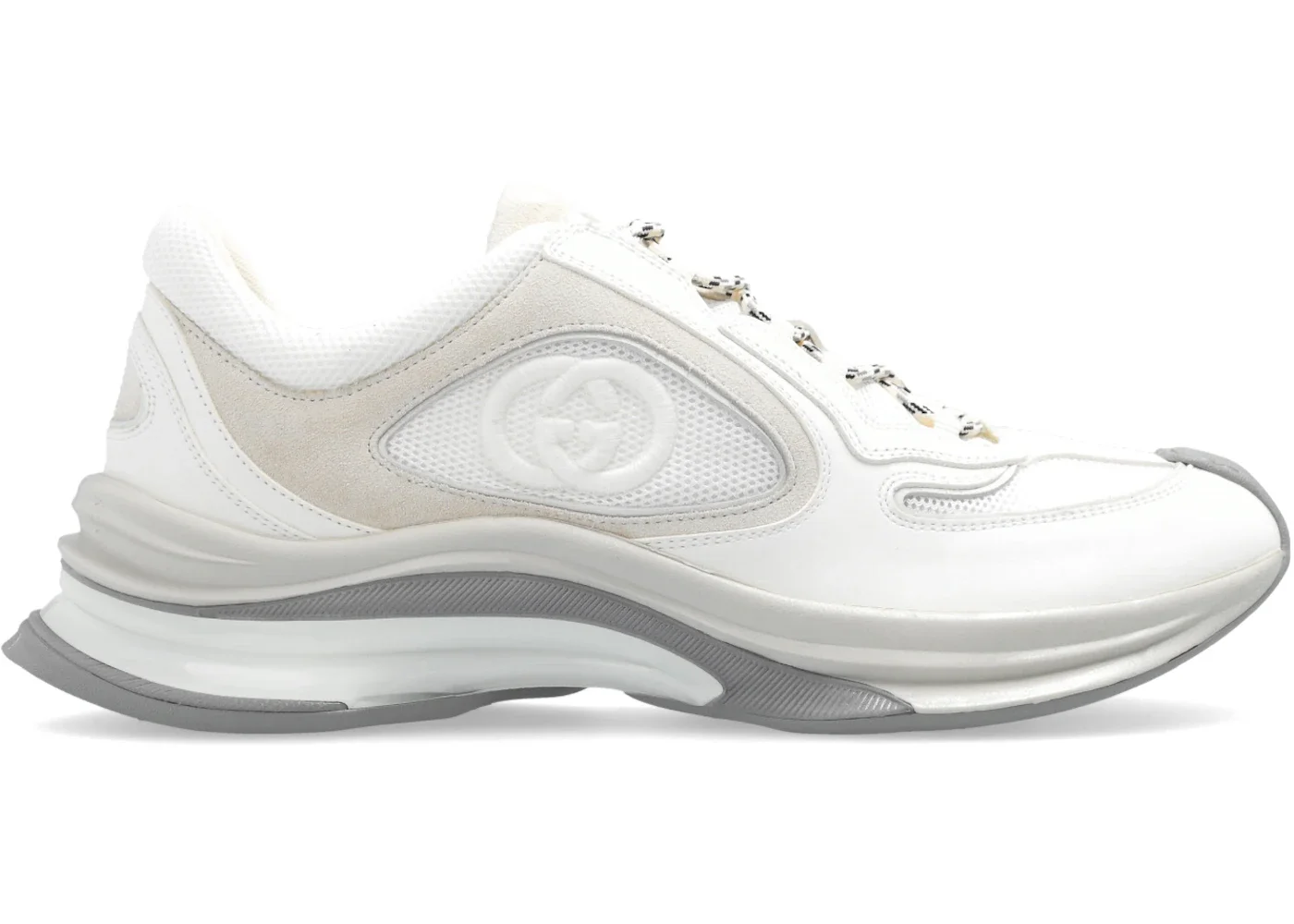 Designs inspired by the sporting world are interpreted through the Gucci lens with standout logo details. This pair of streamlined sneakers is crafted from white suede and enriched with a bi-color rubber sole and an Interlocking G detail. - White suede - Women's - Off white suede trim - Interlocking G - Bi-color rubber sole - Lace-up closure - Low heel - 2.4" height - Made in Italy