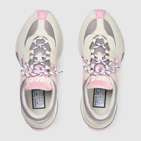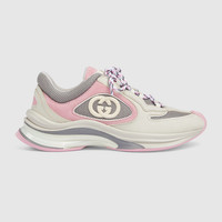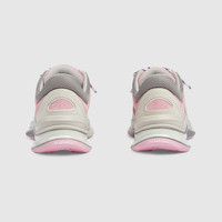 Designs inspired by the sporting world are interpreted through the Gucci lens with standout logo details. This pair of Gucci Run sneakers spotlights ivory suede enhanced by a pink trim, while the unmissable Interlocking G logo completes the style. - Ivory suede - Women's - Pink suede trim - Grey perforated fabric trim - Interlocking G - Bi-color rubber sole - Lace-up closure - Low heel - 2.4" height - Made in Italy