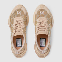 Designs inspired by the sporting world are interpreted through the Gucci lens with standout logo details. A new variation of Gucci Run sneaker appears as part of Fall Winter 2023 with a gleaming GG crystal pattern. This style appears in pink with a white suede trim. - Pink GG crystal mesh - Women's - Pink suede trim - Gucci at back - Contrasting Interlocking G detail - Bi-color rubber sole - Loop at the back - Lace-up closure - Mid-heel - 2.4" height - Made in Italy