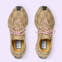 Designs inspired by the sporting world are interpreted through the Gucci lens with standout logo details. This pair of streamlined sneakers is crafted from printed leather and defined by an all-over GG motif. - Beige and ebony leather with GG water transfer print - Women's - Gucci logo at back outersole - Rubber sole - Additional pair of laces included - Lace-up closure - Mid-heel - 2.4" height - Made in Italy
