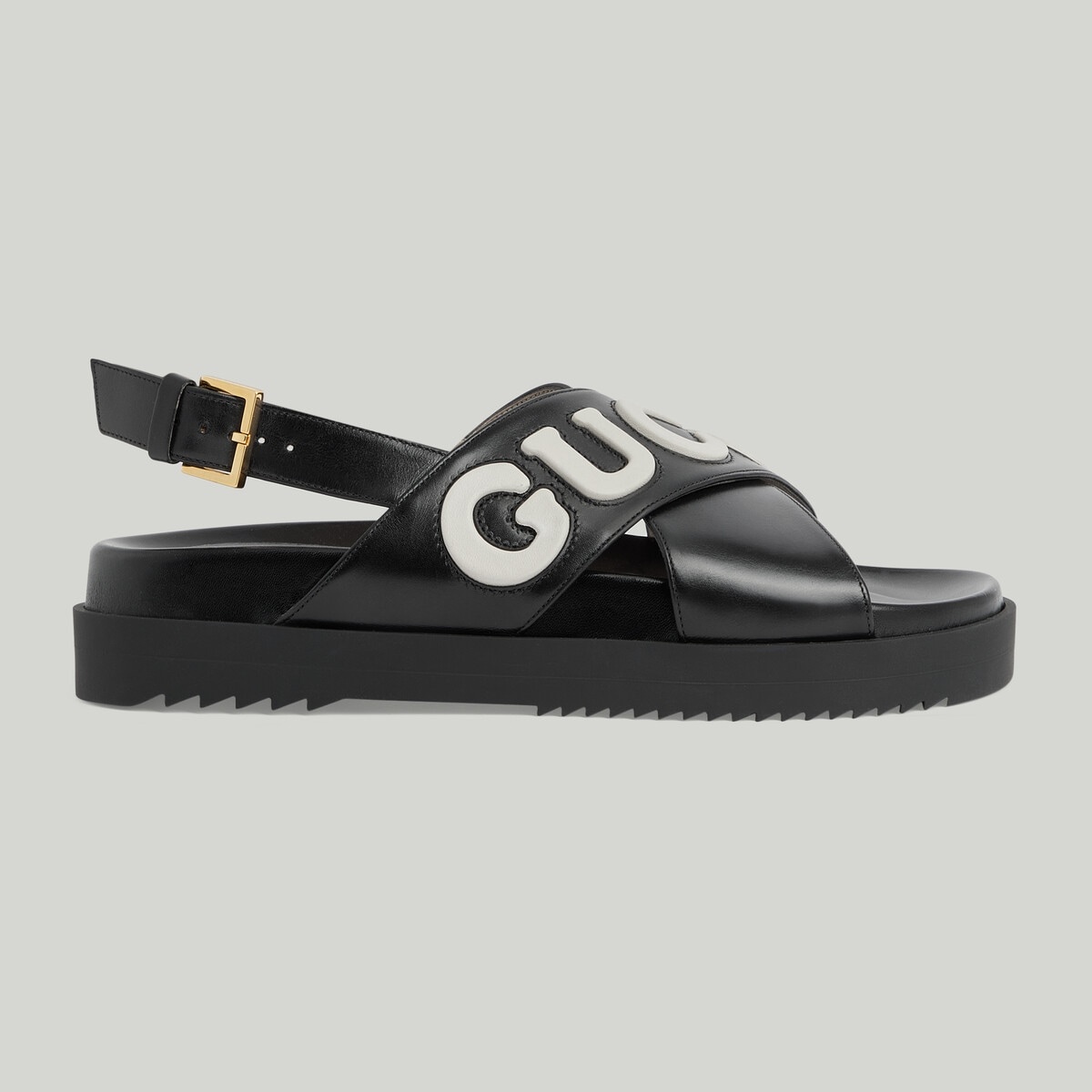 This pair of women's sandal is crafted in black leather and defined by a Gucci script on the front in contrasting white leather, adding a bold logo feel to the style. - Black and white leather - Women's - Gucci script - Rubber sole - Slingback buckle closure - Flat - Made in Italy