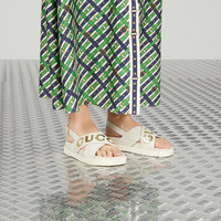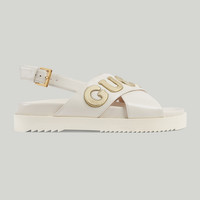 This pair of women's sandal is crafted in white leather and defined by a Gucci script on the front in contrasting metallic gold leather, adding a bold logo feel to the style. - White and metallic gold leather - Women's - Gucci script - Rubber sole - Slingback buckle closure - Flat - Made in Italy
