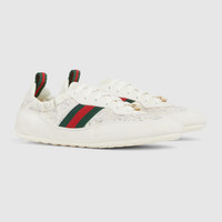 Introducing the Gucci Shift, an ultralight design which reinterprets athletic codes for a different pace. Conjuring a refined sense of movement, its streamlined silhouette is complete with the Web stripe and an elastic back design that can be worn on or off the heel for versatile styling and everyday ease. Embellished with GG crystal, the design blends lightness and sparkle that celebrates the House monogram. - Off white mesh with GG crystals - Off white suede trim - Web detail on the side and loop on the back - Nylon lining - Interlocking G hardware detail in the lace - Gucci logo on the heel - Elasticized heel - Lace-up closure - Flat - Made in Italy - Dedicated dust bag