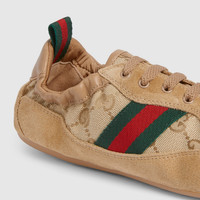 Introducing the Gucci Shift, an ultralight design which reinterprets athletic codes for a different pace. Conjuring a refined sense of movement, its streamlined silhouette is complete with the Web stripe and an elastic back design that can be worn on or off the heel for versatile styling and everyday ease. - Light beige GG canvas - Beige suede trim - Green and red Web detail on the side and loop on the back - Nylon lining - Interlocking G hardware detail in the lace - Elasticized heel - Lace-up closure - Flat - Made in Italy - Fits true to size - Dedicated dust bag