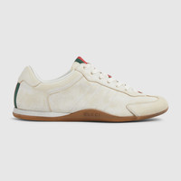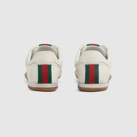 Introducing the Gucci Shift, an ultralight design which reinterprets athletic codes for a different pace. The leather with a distinctive washed finish gives each item a unique character. Complete with side stitching and Web details that flow through the style like a continuous stripe, the sleek silhouette conjures a refined sense of movement and everyday elegance. - White washed-effect leather - Leather lining - Green and red Web tongue and detail on the back - Gucci logo on the bi-color rubber outsole and sole - Lace-up closure - Flat - Height: 0.4" - Made in Italy - Dedicated dust bag
