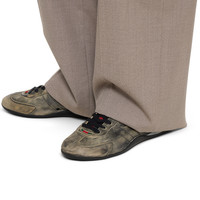 Introducing the Gucci Shift, an ultralight design which reinterprets athletic codes for a different pace. The leather with a distinctive washed finish gives each item a unique character. Complete with side stitching and Web details that flow through the style like a continuous stripe, the sleek silhouette conjures a refined sense of movement and everyday elegance. - Black washed-effect leather - Leather lining - Green and red Web tongue and detail on the back - Gucci logo on the bi-color rubber outsole and sole - Lace-up closure - Flat - Height: 0.4" - Made in Italy - Dedicated dust bag