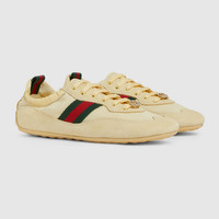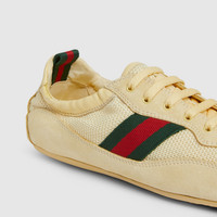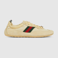 Introducing the Gucci Shift, an ultralight design which reinterprets athletic codes for a different pace. Conjuring a refined sense of movement, its streamlined silhouette is complete with the Web stripe and an elastic back design that can be worn on or off the heel for versatile styling and everyday ease. - Light yellow technical fabric - Light yellow suede trim - Green and red Web detail on the side and loop on the back - Nylon lining - Interlocking G hardware detail in the lace - Elasticized heel - Lace-up closure - Flat - Made in Italy - Dedicated dust bag