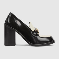 A tribute to the brand's equestrian history, this women's mid-heel loafer is defined by a light gold-toned Horsebit hardware and crafted in smooth and shiny patent leather. - Black and white patent leather - Light gold-toned hardware - Horsebit - Leather sole - Mid-heel - Height: 3.7" - Made in Italy