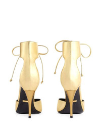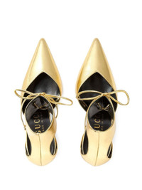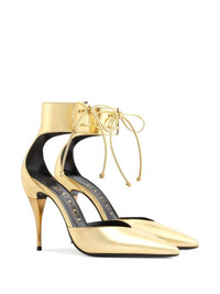 ankle-cuff metallic leather pumps This SS23 Gucci reinvents some of the brand's historic classics by delving into the Italian House's past. These pointed pumps are made of metallic gold leather, inspired by styles from the houses archives. This pair has a classic charm thanks to the front tie-fastening, pointed toe and contrast high heel. Made in Italy Composition Outer: Metallic Leather 100% Lining: Leather 100% Sole: Leather 100%