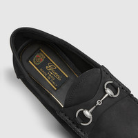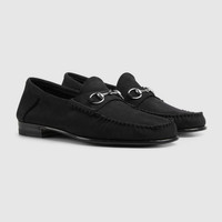 One of the House's most signature styles, the Gucci 1953 loafer is presented here crafted in refined and soft suede. The lightweight material is easily foldable, ensuring maximum comfort. The classic Horsebit hardware that defines the style acts like a tribute to Gucci's heritage. - Black suede - Women's - Silver-toned hardware - Horsebit - Insole with extra cushioning - Flexible leather sole - Flat - Height: 0.5" - Made in Italy