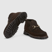 Designed with the classic shape of the loafer, the Horsebit ankle boot bridges the past to the present. Crafted by suede and defined by a slim silhouette, the boot pays homage to the House's history. - Dark brown suede - Light gold-toned hardware - Leather lining - Horsebit - Rubber sole - Flat - Heel height: 0.5" - Made in Italy
