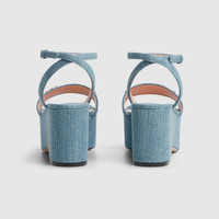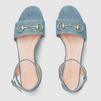 The iconic Horsebit defines this pair of leather flatform sandals. The leather sole and the adjustable ankle closure complete the style, enhancing its modern spirit. - Light blue denim - Light gold-toned hardware - Leather lining - Horsebit - Leather sole - Adjustable buckle closure - Mid-heel - Height: 2.9" - Made in Italy