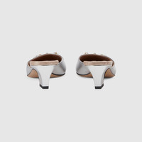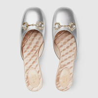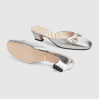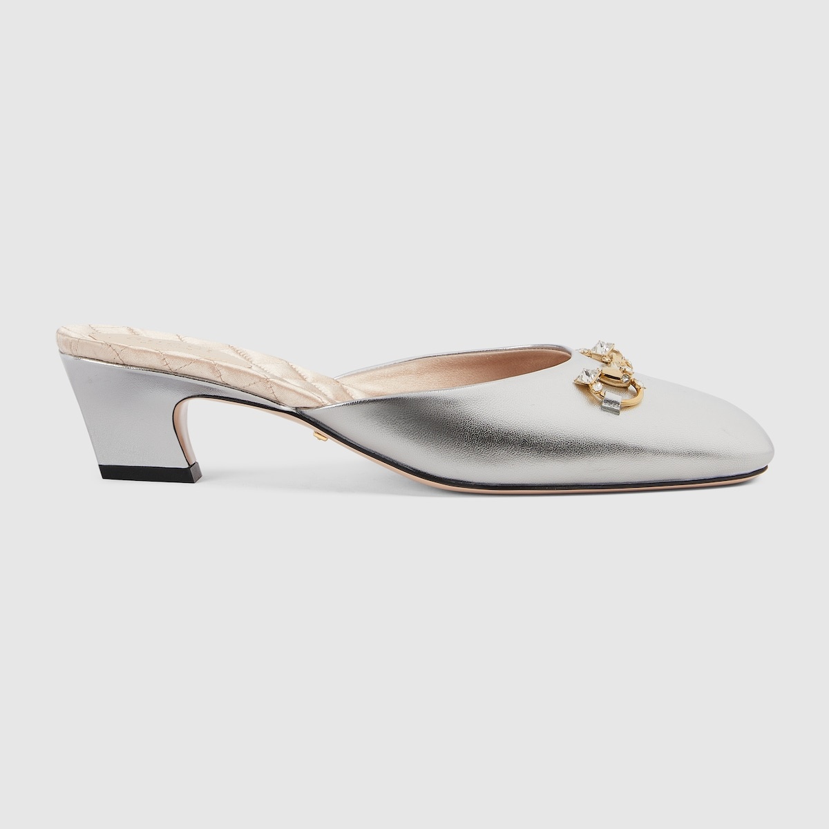 Subtle House details add a logo touch to this pair of mules. Inspired by the origins of the brand, a new precious version of the emblematic Horsebit defines the shoe. Presented in silver metallic leather, the matelassè lining completes the style. - Silver metallic leather - Women's - Horsebit with crystals - Matelassè lining - Leather sole - Low heel - Heel height: 1.7" - Made in Italy