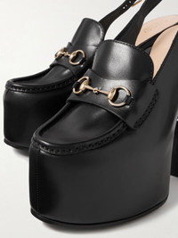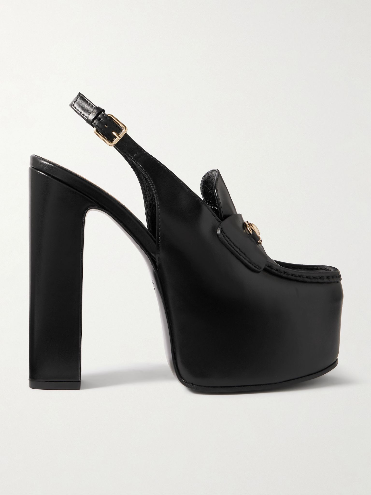 Gucci loves drama, and these pumps from the Fall '24 runway deliver it in spades. Made from black leather, they have sleek slingback straps and loafer-like vamps featuring horsebit embellishments. The chunky platforms balance out the towering block heel. Details & Care - Black leather (Calf) - Buckle-fastening slingback strap