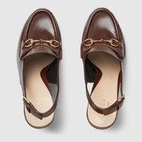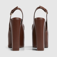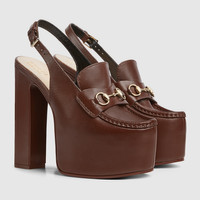 Gucci continues to feature archival symbols. For the latest collection, the Horsebit hardware recalls the House's equestrian heritage. This pair of women's slingbacks are defines by the platform high heel that offers stability and comfort. - Dark brown leather - Women's - Light gold-toned hardware - Horsebit - Tone-on-tone leather sole - Adjustable ankle closure with buckle - High heel - Height: 5.7"