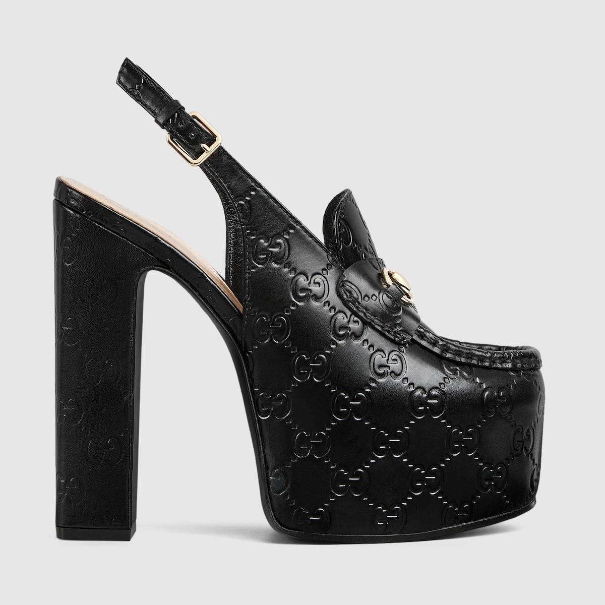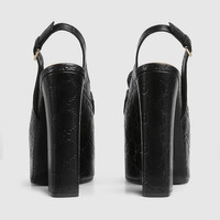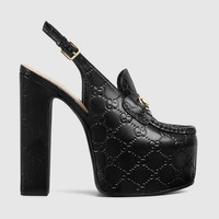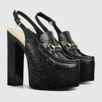 Gucci continues to feature archival symbols. For the latest collection, the Horsebit hardware recalls the House's equestrian heritage. This pair of women's slingbacks are defines by the platform high heel that offers stability and comfort. - Black GG leather - Women's - Light gold-toned hardware - Horsebit - Tone-on-tone leather sole - Adjustable ankle closure with buckle - High heel - Height: 5.7"