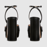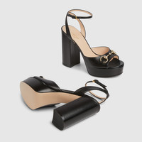The signature Horsebit defines this pair of leather sandals. The high heel and the adjustable buckle closure complete the style. - Black leather - Women's - Light gold-toned hardware - Horsebit - Adjustable ankle buckle closure - High heel - Height: 4.5", with a 1.1" platform and 3.3" heel - Made in Italy
