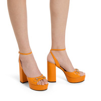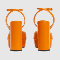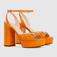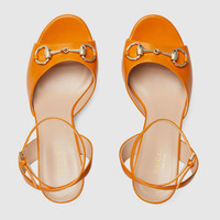 The House's signature Horsebit adds a touch of elegance on this pair of high-heel sandals, crafted in soft, refined leather. The adjustable buckle closure completes the style. - Orange leather - Light gold-toned hardware - Leather lining - Horsebit - Open toe - Leather sole - Adjustable ankle buckle closure - High heel - Height: 4.5", with a 1.1" platform and 3.3" heel - Made in Italy
