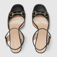 The signature Horsebit defines this pair of black leather sandals with an open toe. A mid-heel and adjustable buckle closure complete the style. - Black leather - Women's - Light gold-toned hardware - Horsebit - Open toe - Adjustable ankle closure - Mid-heel - Heel height: 3" - Made in Italy