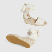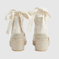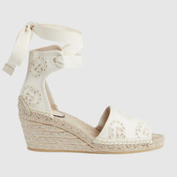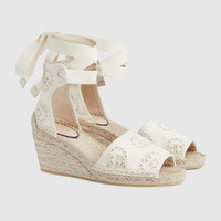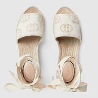 Crafted in ivory canvas set against a cord platform, these espadrilles explore the rich contrasts seen throughout the latest Gucci collection. Featuring the emblematic Interlocking G motif, the style is finished with a tonal ribbon. - Ivory Interlocking G canvas - Women's - Cord platform with rubber sole - Ribbon ankle tie closure - Mid-heel - Made in Spain