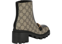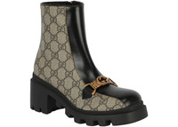 Unexpected materials, shapes and details come together throughout the Gucci Aria collection. This pair of ankle boots mixes vintage, sports and equestrian influences to create a hybrid design. Crafted from GG Supreme canvas, a material from the archives, the shoe is completed by a chunky lug sole and Interlocking G Horsebit hardware. - Beige and ebony GG Supreme canvas - Women's - Black leather trim - Interlocking G Horsebit - Rubber lug sole - Mid-heel - 2.2" heel height with 0.8" platform, based on a size 37 (IT) - Made in Italy