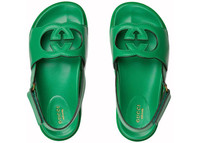 Influenced by an archival design from the '70s-a hallmark era of the House, the Interlocking G appears as a maxi cut-out detail atop this leather sandal. An ode to timeless elegance, the latest Gucci collection explores archival symbols in new ways. - Green leather - Women's - Interlocking G cut-out - Rubber sole - Adjustable ankle strap with Velcro - Flat - Made in Italy