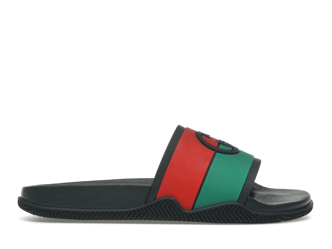 House codes define this rubber slide sandal. Paying tribute to two symbols of from the archives, the Interlocking G, a reference to Guccio Gucci's monogram, mixes with red and green stripes—a reference to the House Web. - Red and green Interlocking G striped rubber and black footbed - Women's - Rubber sole - Flat - Made in Italy