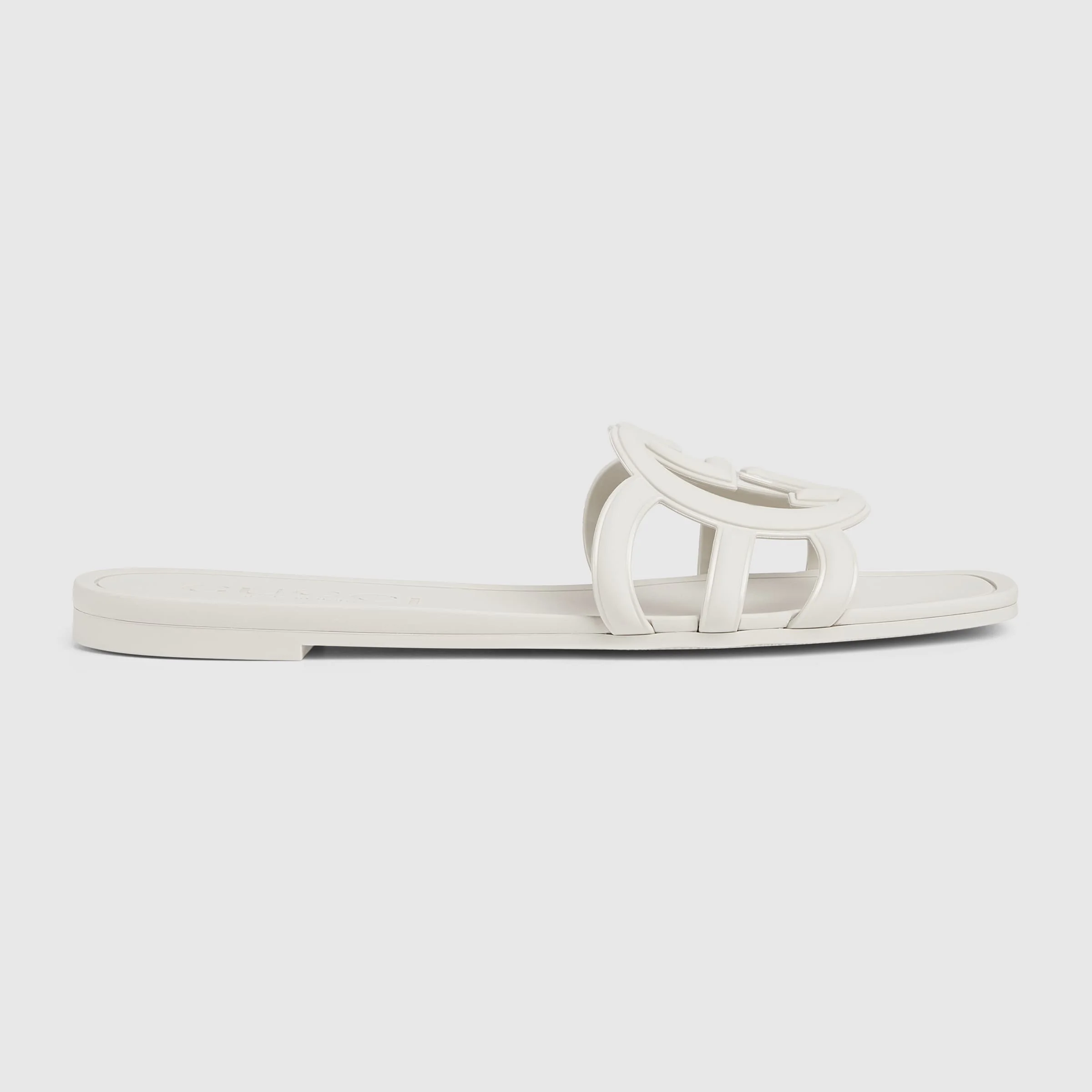 Emblematic codes of the House and refined patterns are reinterpreted in contemporary ways for the Pre-Fall collection. This slide sandal appears in white rubber with an Interlocking G cut-out enriching the style with a distinct logo feel. - White rubber - Women's - Interlocking G cut-out - Rubber sole - Flat - 0.4" heel height - Made in Italy