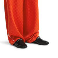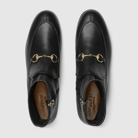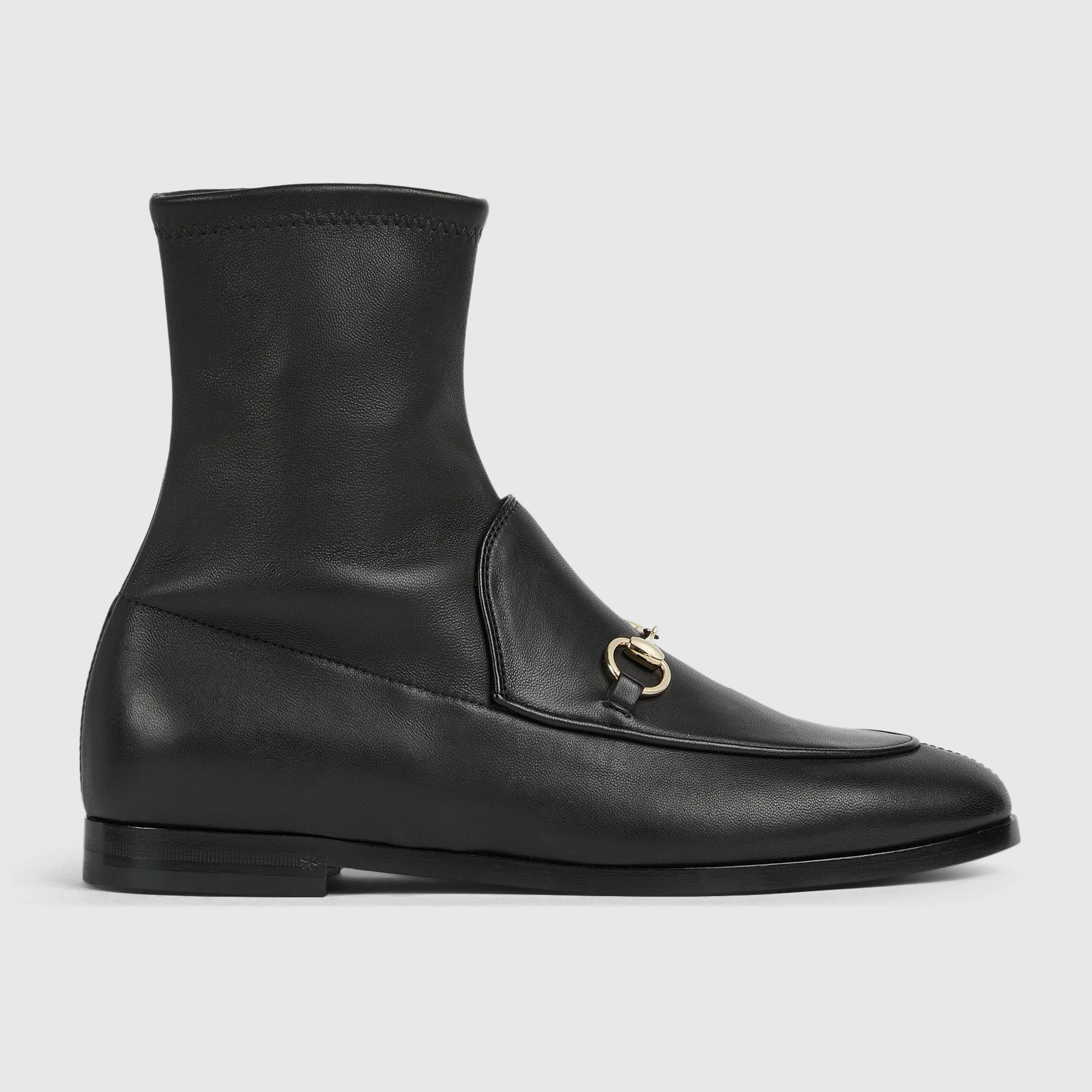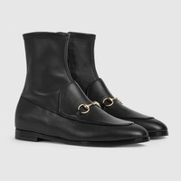 The Gucci Jordaan loafer is a key silhouette that spans across seasons. A classic shape that here is presented as an ankle boot, crafted from smooth leather and enhanced by a light gold-toned Horsebit. - Black leather - Light gold-toned hardware - Horsebit - Leather sole - Zip closure - Flat - Height: .3" - Made in Italy