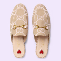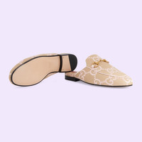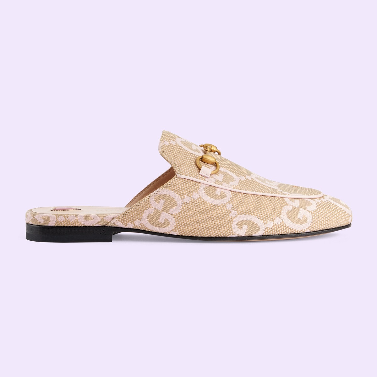Since its debut in the Fall Winter 2015 collection, the Princetown slipper has become a mainstay of Gucci collections. Unconventional yet entirely modern, the influential accessory is a contemporary interpretation of the Horsebit loafer, envisioned for the latest collection in beige and pink jumbo GG canvas. - Beige and pink jumbo GG canvas - Women's - Gold-toned hardware - Horsebit detail - Leather sole - Flat - .4" heel - Made in Italy
