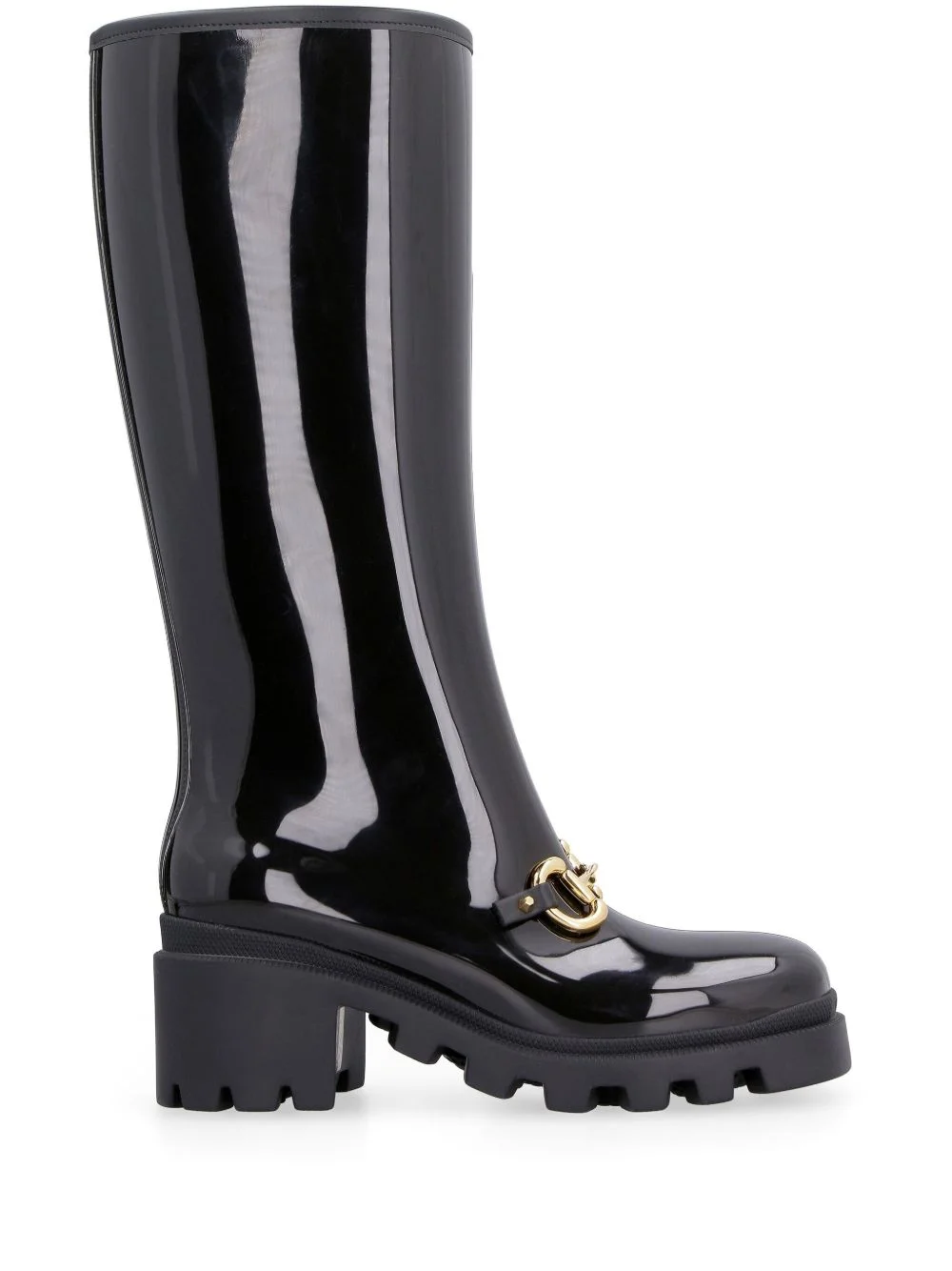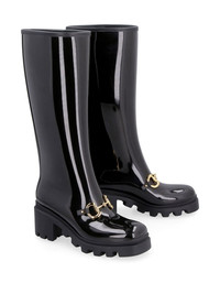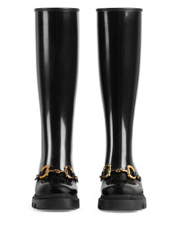 Rubber adds a playful, retro-inspired note to essential designs. Presented in black, this pair of knee-high boots is accentuated by the Horsebit—an archival code that pays tribute to the House's equestrian history. The design features details in Demetra. Created with the same processes used for tanning, the new material offers pliable and resilient performance with a supple finish. The eco-friendly material combines animal-free raw materials primarily from sustainable, renewable, and bio-based sources. - Black rubber with details in Demetra—crafted from animal-free raw materials that are primarily from sustainable, renewable, and bio-based sources - Women's - Horsebit - Rubber sole - Low heel - 1.6" heel height - Made in Italy