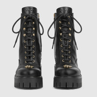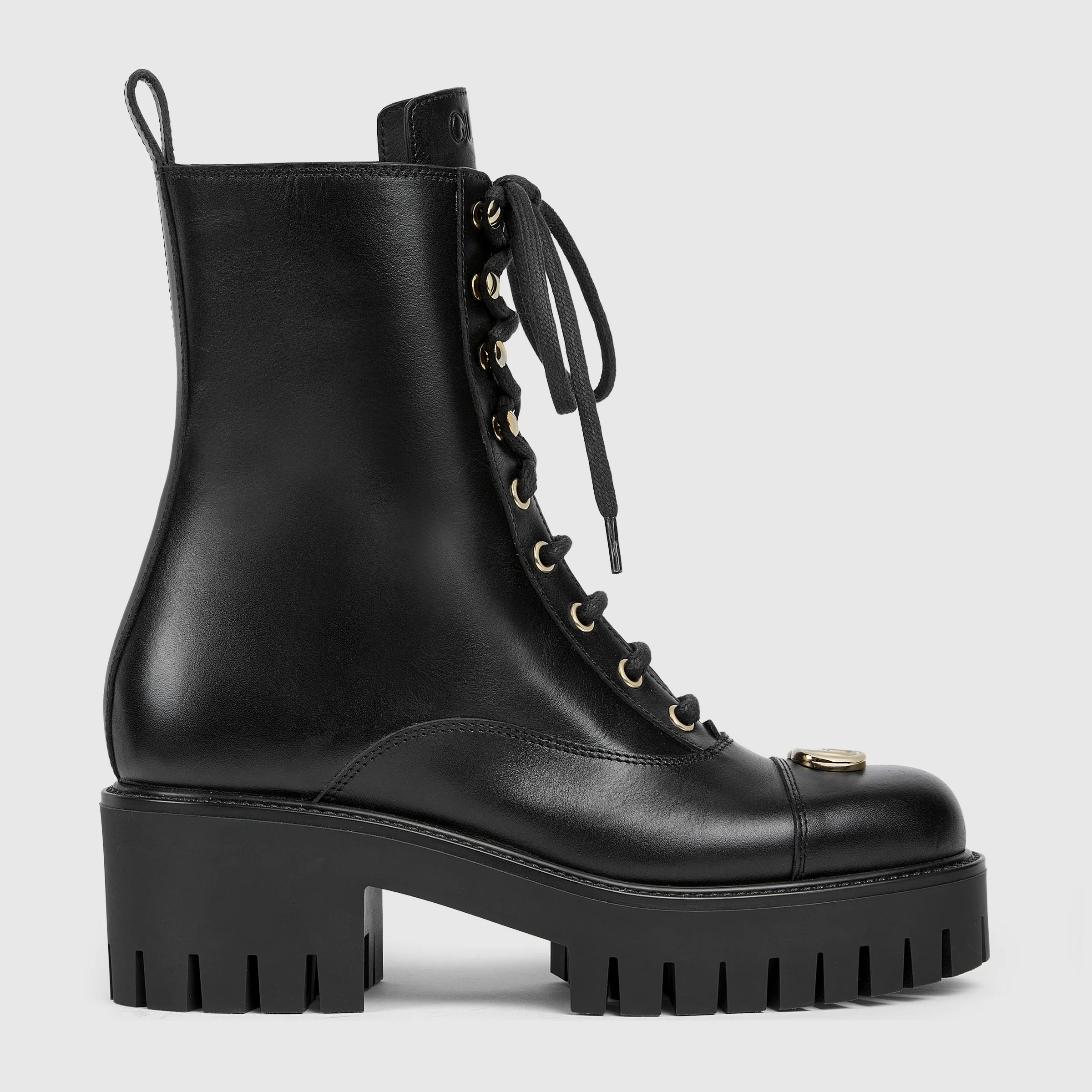 Crafted with a contemporary attitude, this women's lace-up ankle boot features an embossed Gucci detail that subtly nods to the House’s storied heritage. Set on a chunky rubber lug sole, the silhouette blends utilitarian design with elevated elegance. - Black leather - Embossed Gucci detail - Double G detail - Rubber lug sole - Lace-up closure - Low heel - Height: 1.3" on the front, 2.3" at the back - Made in Italy