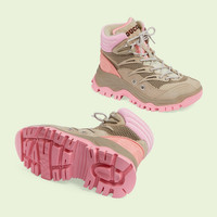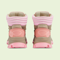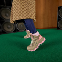 Gucci's origins are rooted in the world of sports and leisure. From when a young Guccio Gucci took inspiration from the leather luggage carried by the jet set while working at a luxury London hotel, the brand has interpreted this concept into each collection. A contemporary take on the narrative, this pair of lace-up boots is reminiscent of outerwear. - Beige mesh fabric - Women's - Beige suede details - 'Gucci' embroidery - Rubber Interlocking G at the side - Rubber sole - Contrast padding at the ankle - Lace-up closure - Mid heel - 2" height - Made in Italy