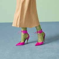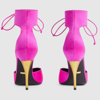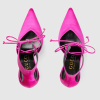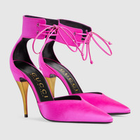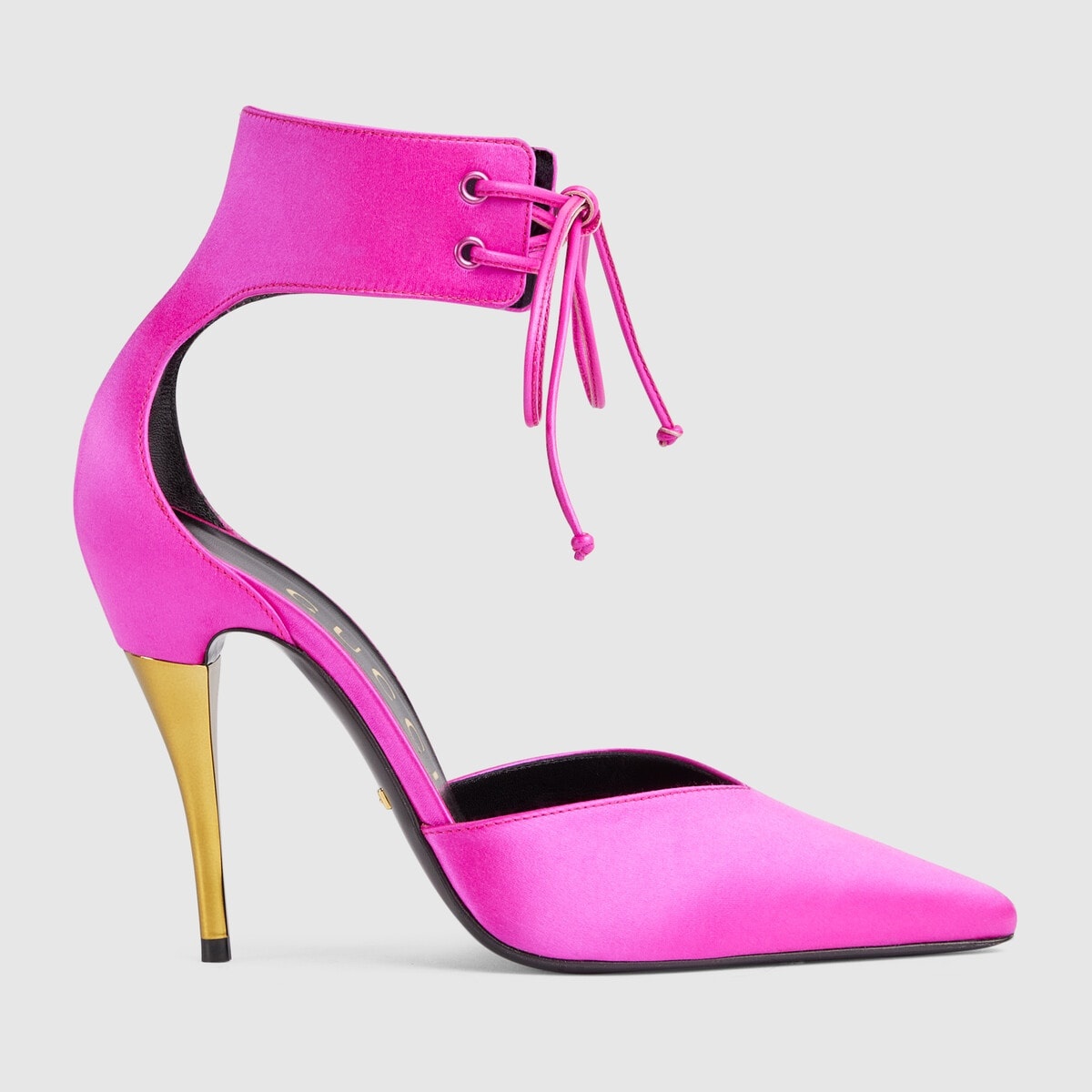 Retro shapes and metallic materials frame designs with an early 2000s aesthetic. This statement pump is presented in fuchsia satin while an ankle strap with lace-up closure enhances the elegant silhouette of the style. - Fuchsia satin - Women's - Leather sole - Pointed toe - Metallic heel - Ankle strap with lace-up closure - Made in Italy
