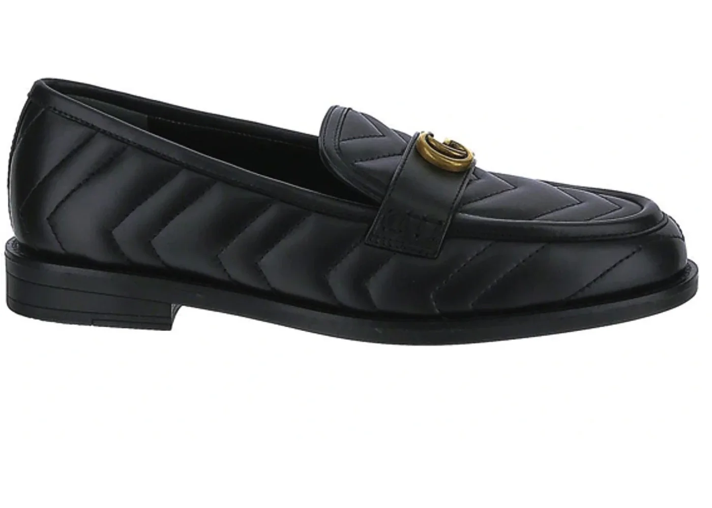 Characteristic of the House's designs, this pair of leather loafers is defined by a matelassé finish. Guccio Gucci's monogram hardware completes the style with a logo feel. - Black chevron matelassé leather - Women's - Double G - Leather sole - Flat - .6" heel height - Made in Italy