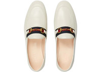 The white leather loafer has a slim shape with a rounded square toe, completed with the House Web and the Horsebit. Since the introduction of its classic shape in 1950s, the preppy-inspired shoe has continued its influence, redesigned with different details, in new forms and materials. - White leather - Women's - Blue and red Web - This product contains leather made through an alternative chrome free tanning process, reducing the environmental footprint compared to traditional methods. - Horsebit - Flat - .4" heel height - Made in Italy - The back is designed to be worn with the heel folded down or up