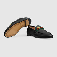The black leather loafer has a slim shape with a rounded square toe, completed with the House Web and the Horsebit. Since the introduction of its classic shape in 1950s, the preppy-inspired shoe has continued its influence, redesigned with different details, in new forms and materials. - Black leather - Women's - Green and red Web - This product contains leather made through an alternative chrome free tanning process, reducing the environmental footprint compared to traditional methods. - Horsebit - Flat - .4" heel height - Made in Italy - The back is designed to be worn with the heel folded down or up