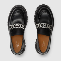 The chunky lug sole defines this loafer crafted in black leather. Taken straight from the '70s archives, the Founder's monogram paired with a chain detail is presented on top of this distinguished style. - Black leather - Women's - Silver-toned hardware - Interlocking G detail and chain - Lug rubber sole - Flat - 1.8" heel height with 1.2" platform, based on a size 37 (IT) - Made in Italy
