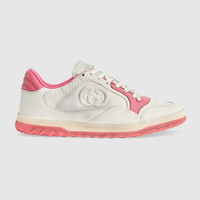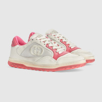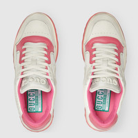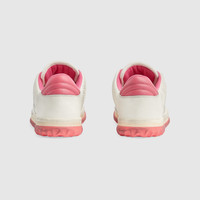 A discreet Interlocking G speaks to the subtle narrative that runs through the collection. Presented against off white leather, the motif brings the House logo to the fore in this retro-inspired sneaker design. - Off white and pink leather - Women's - Off white fabric insert - Interlocking G embroidery - Round toe - Rubber sole - Gucci embroidery - Additional pair of laces included - Lace-up closure - Flat - 1.2" height - Made in Italy - Treated for a distressed effect, these shoes undergo a dedicated aging process which makes each product unique and the final color may vary from the photo.