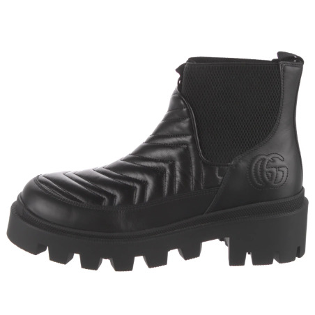 Playing with textures and materials, this Chelsea boot mixes smooth black leather with textured chevron matelassé details. The style is completed by the House's monogram, presented as an intricate stitched detail. - Black leather - Women's - Tonal chevron matelassé leather details - Stitched Double G detail - Lug sole - Elastic inserts and tab at the back for easy slip-on - Made in Italy