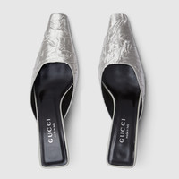 Introduced on the Cruise 2026 runway, this mule exudes 1990s opulence with an elongated, square silhouette. Uniquely textured fabric in silver tone completes the style with a sparkling touch. - Metallic silver-toned textured fabric - Leather lining - Elongated square toe - Square vamp - Metal plate with crystal logo on the back of the right heel - Leather sole - Kitten mid-heel - 2.2" height