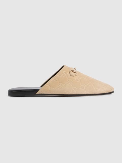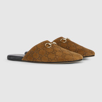 In the Fall Winter 2025 collection, Gucci continues to feature archival symbols. For the latest collection, the Horsebit hardware recalls the House's equestrian heritage. This pair of women's mule is crafted in supple suede and defined by a light gold-toned hardware. - Brown GG suede - Light gold-toned hardware - Horsebit - Leather sole - Flat - Made in Italy