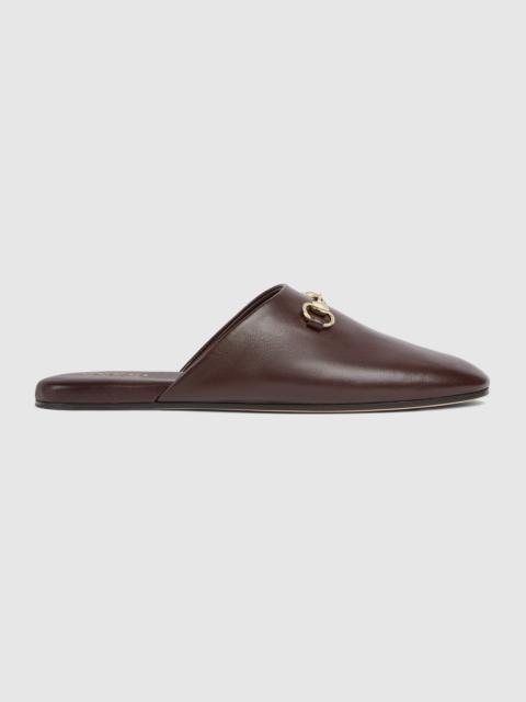 In the Fall Winter 2025 collection, Gucci continues to feature archival symbols. For the latest collection, the Horsebit hardware recalls the House's equestrian heritage. This pair of women's mule is crafted in supple leather and defined by a light gold-toned hardware. - Black leather - Light gold-toned hardware - Horsebit - Leather sole - Flat - Made in Italy