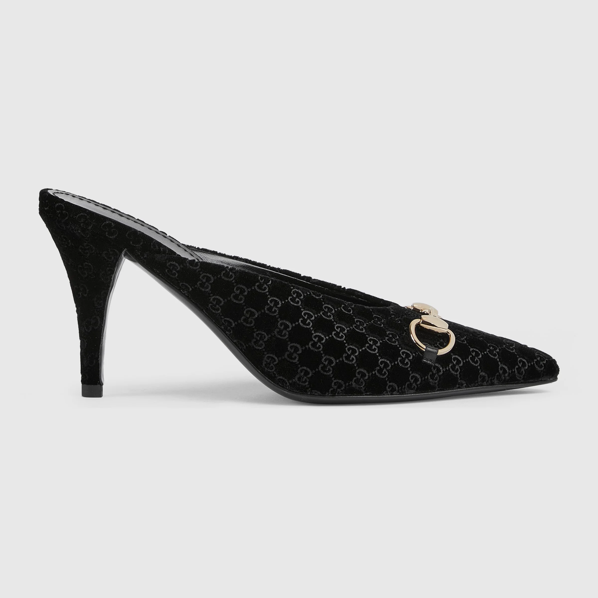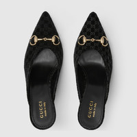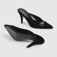Presented in the latest collection, this mule with Horsebit is defined by its elegant silhouette, refined materials and the classic equestrian-inspired symbol in a light gold-toned finish. - Black GG velvet - Light gold-toned hardware - Horsebit - Mid-heel - Height: 3.3" - Made in Italy