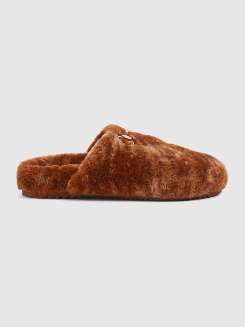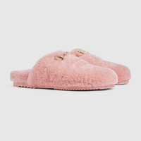 The Horsebit hardware recalls the House's equestrian heritage. This pair of women's mule is crafted in silky merino wool and defined by the hardware in light gold tone. - Pink merino wool - Light gold-toned hardware - Horsebit - Leather sole - Flat - Made in Italy