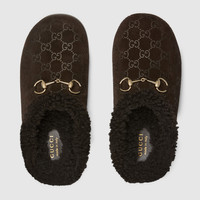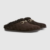 Crafted from GG suede, this women's mule reinterprets the House's heritage through a contemporary lens. The signature Horsebit detail, presented in a light gold-toned finish, adds a refined touch to the design. - Dark brown GG suede - Light gold-toned hardware - Merino wool lining - Horsebit - Rubber sole - Flat - Made in Italy