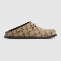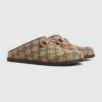 Gucci continues to feature archival symbols in the Pre-Fall 2025 collection. The Horsebit hardware recalls the House's equestrian heritage, appearing atop this pair of GG canvas mules in camel and dark brown. - Camel and dark brown GG canvas - Dark brown leather trim - Gold-toned hardware - Leather lining - Horsebit - Round toe - Rubber sole - Flat - Made in Italy
